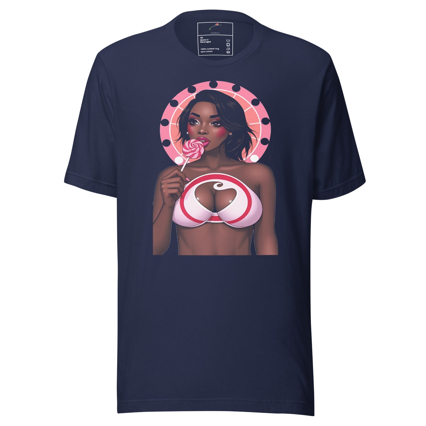 Luce un estilo único con la camiseta "Fun Girl Licking Lollipop", una combinación perfecta de moda y estilo. Esta moderna camiseta de Printful es tu opción ideal para marcar la diferencia. Su llamativo estampado presenta un diseño divertido que sin duda llamará la atención allá donde vayas.