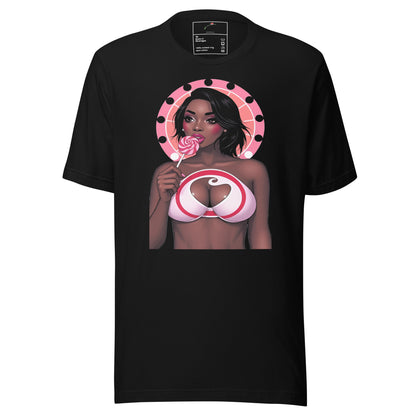 Showcase your playful side with this cute graphic tee featuring a fun girl licking a lollipop.