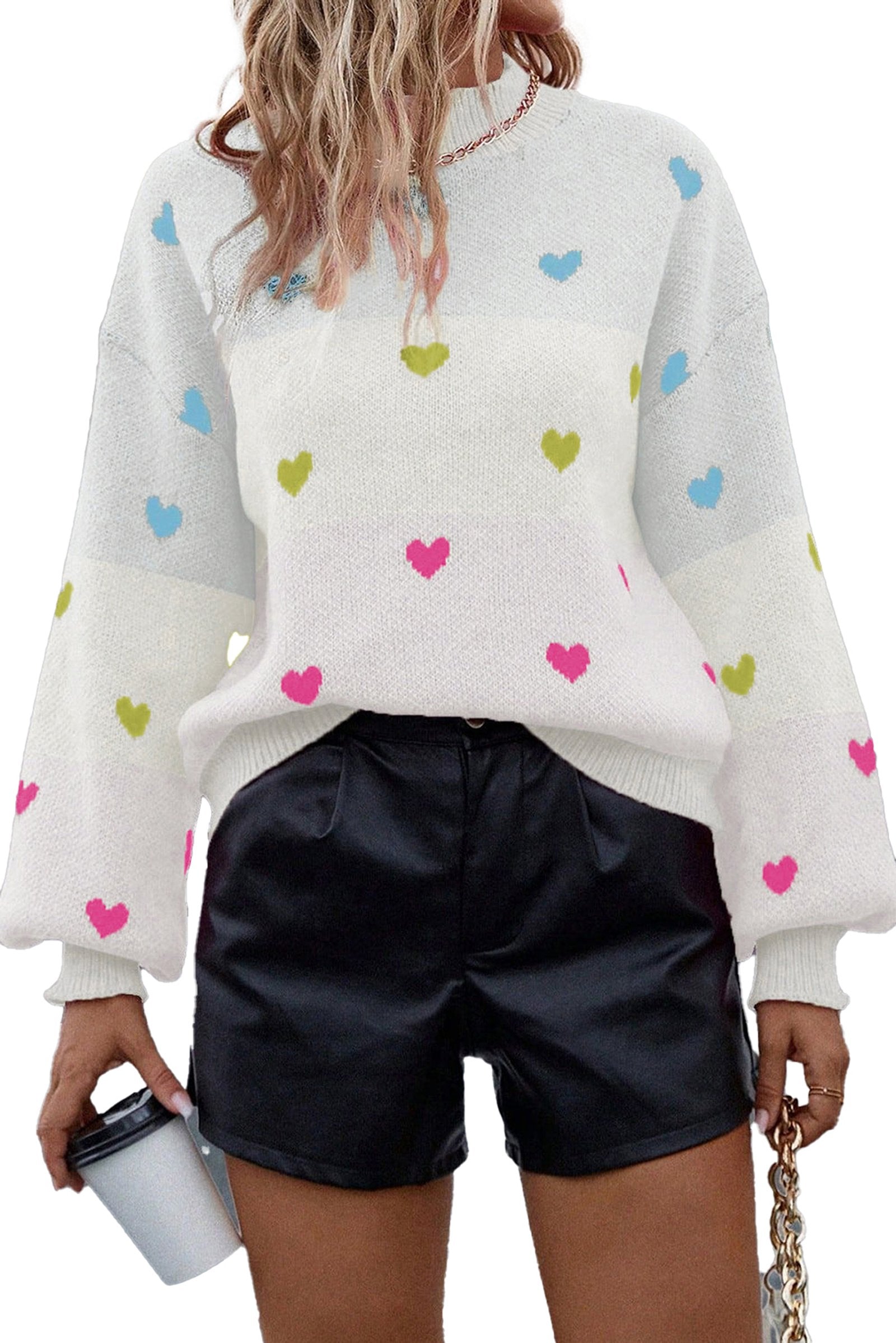 Not only does the multicolor heart pattern sweater stand out with its unique colorblock style, but it is also versatile enough to match different accessories. Choose bold jewelry and chic handbags to complete your trendy ensemble. The cheerful heart pattern brings an element of fun to your everyday outfits.