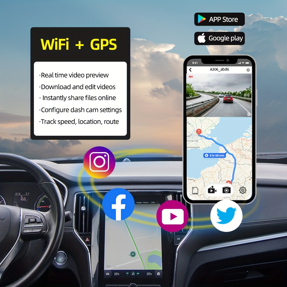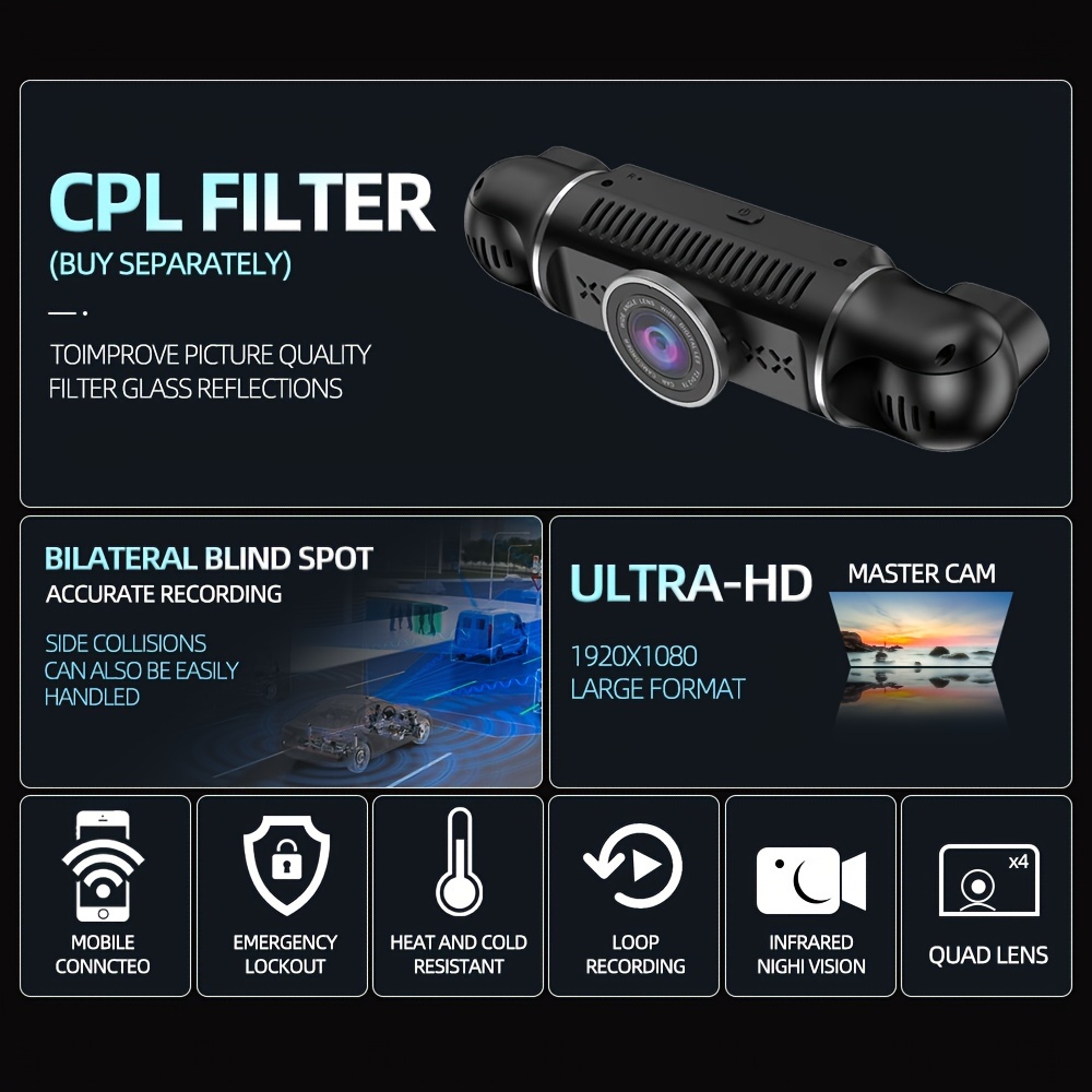 Capture footage from all angles with WiFi GPS Front+Left+Right+Rear 4-Channel Lens HD 1080P Super Night Vision WDR G-sensor Loop Recording