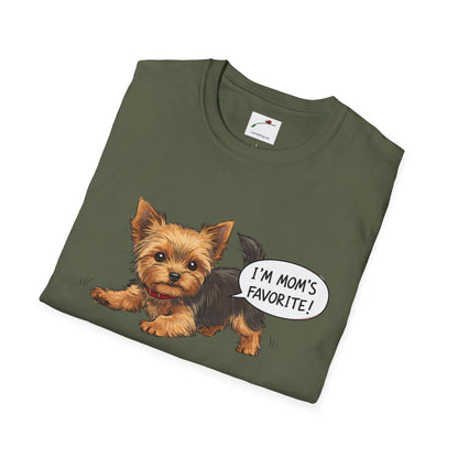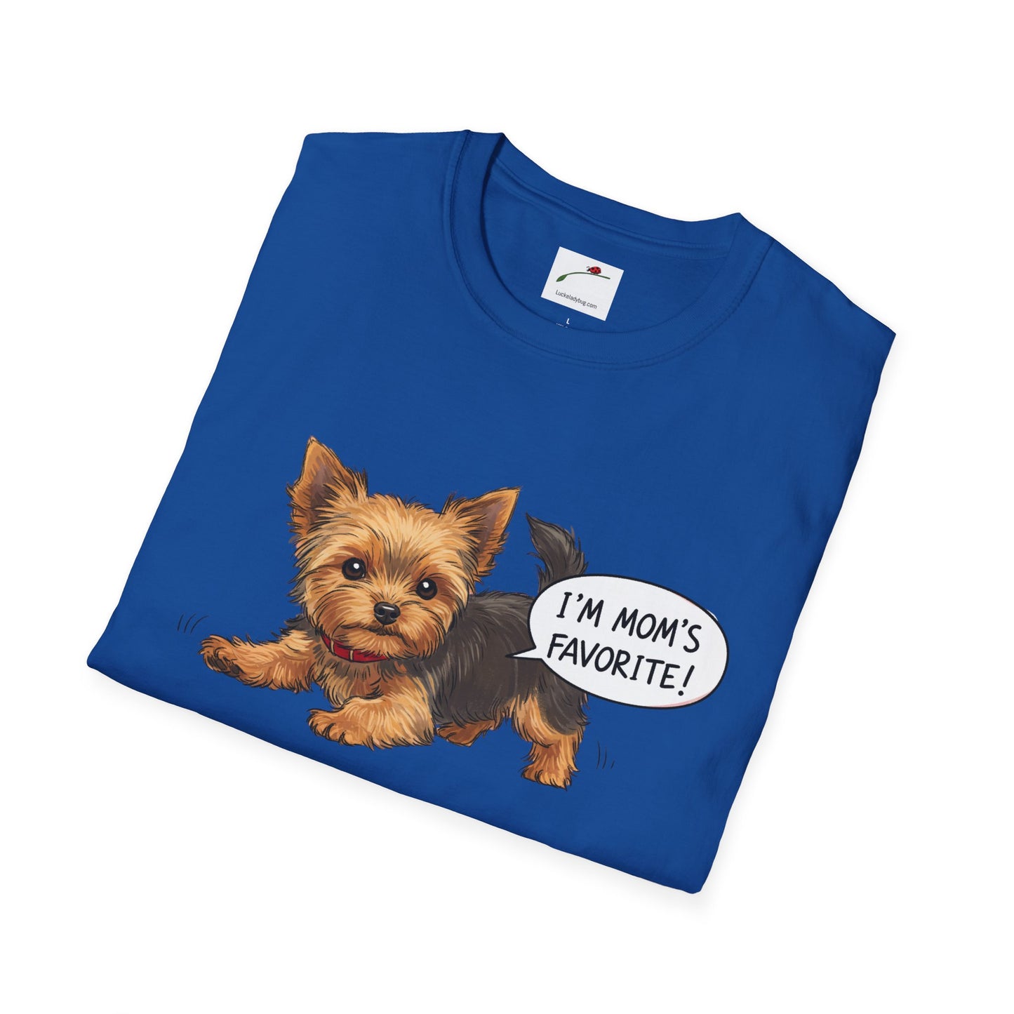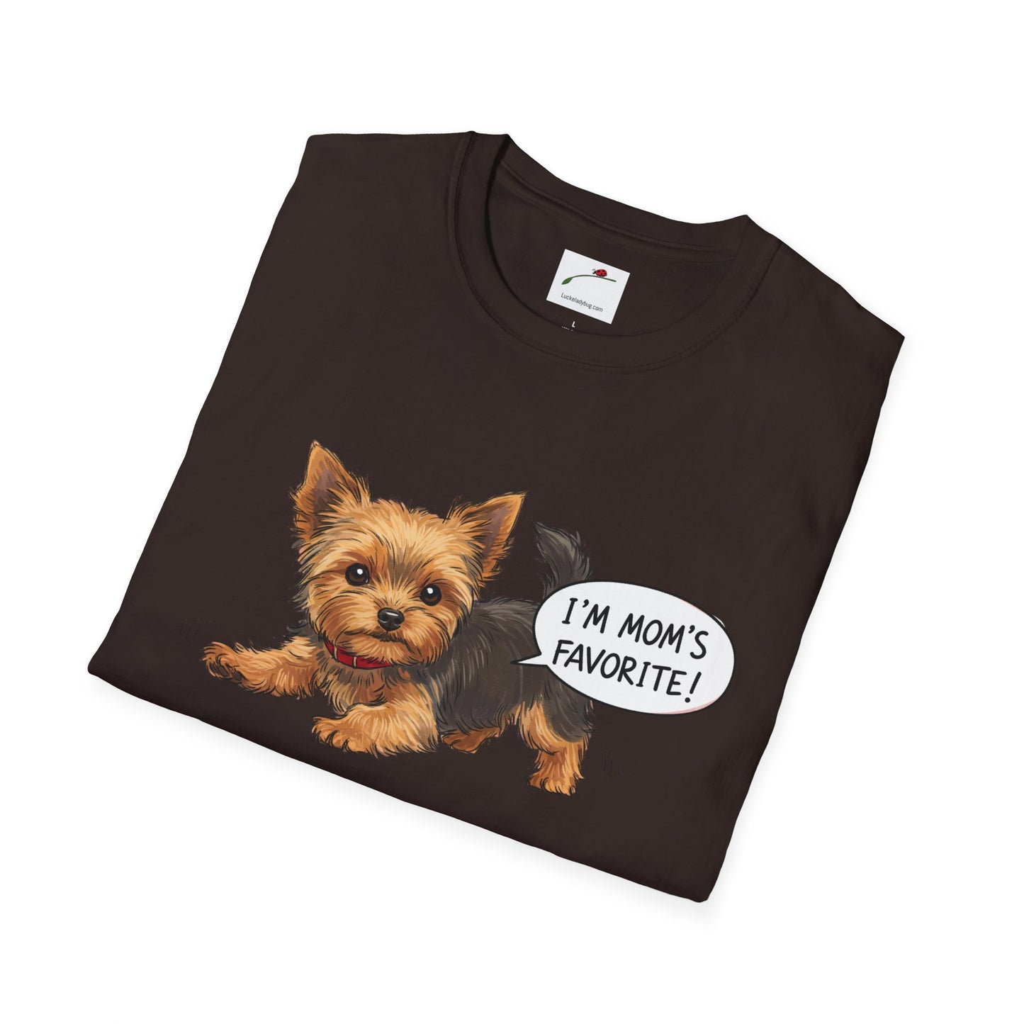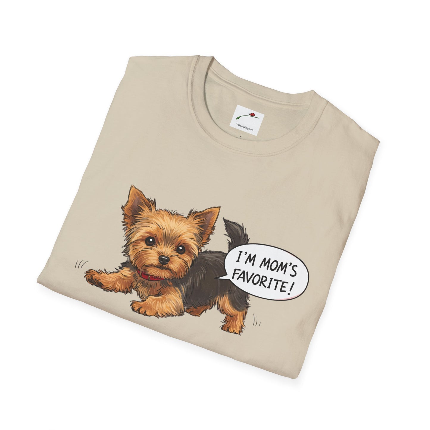 This cute Yorkie dog mom shirt for women is the perfect blend of style and comfort. Designed by LuckeLadybug, it features a playful illustration of a Yorkie with a speech bubble that says, "I'm Mom's Favorite!" The soft fabric feels gentle on the skin. You can wear it everywhere, whether running errands or relaxing at home.