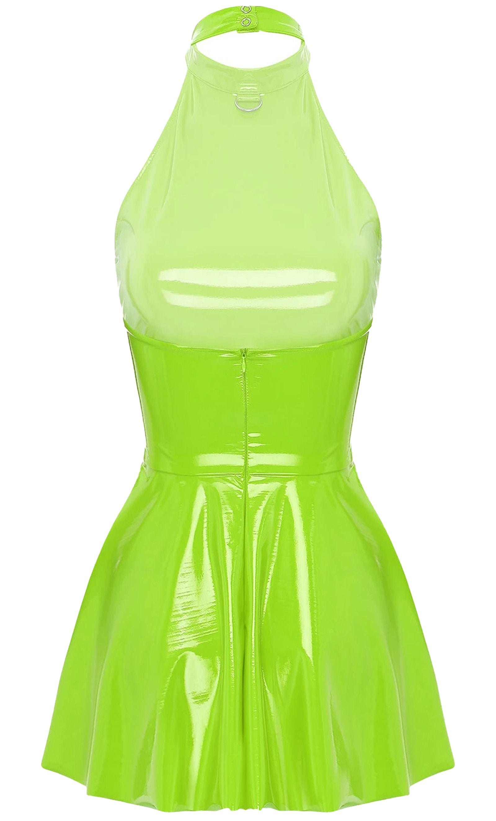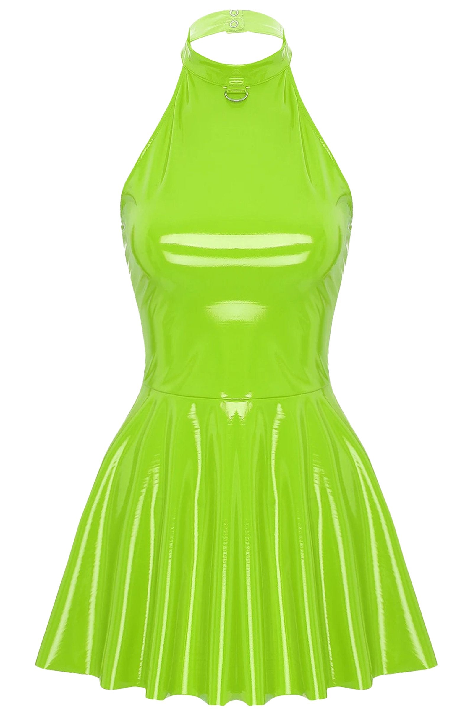 The sleeveless design offers a flattering silhouette, perfect for showcasing your arms while keeping you cool and comfortable. The high neckline adds a touch of sophistication, while the flared hemline enhances the playful swing of the dress. Whether you’re hitting the dance floor or enjoying a night out, this glossy patent leather mini dress guarantees you'll stand out.