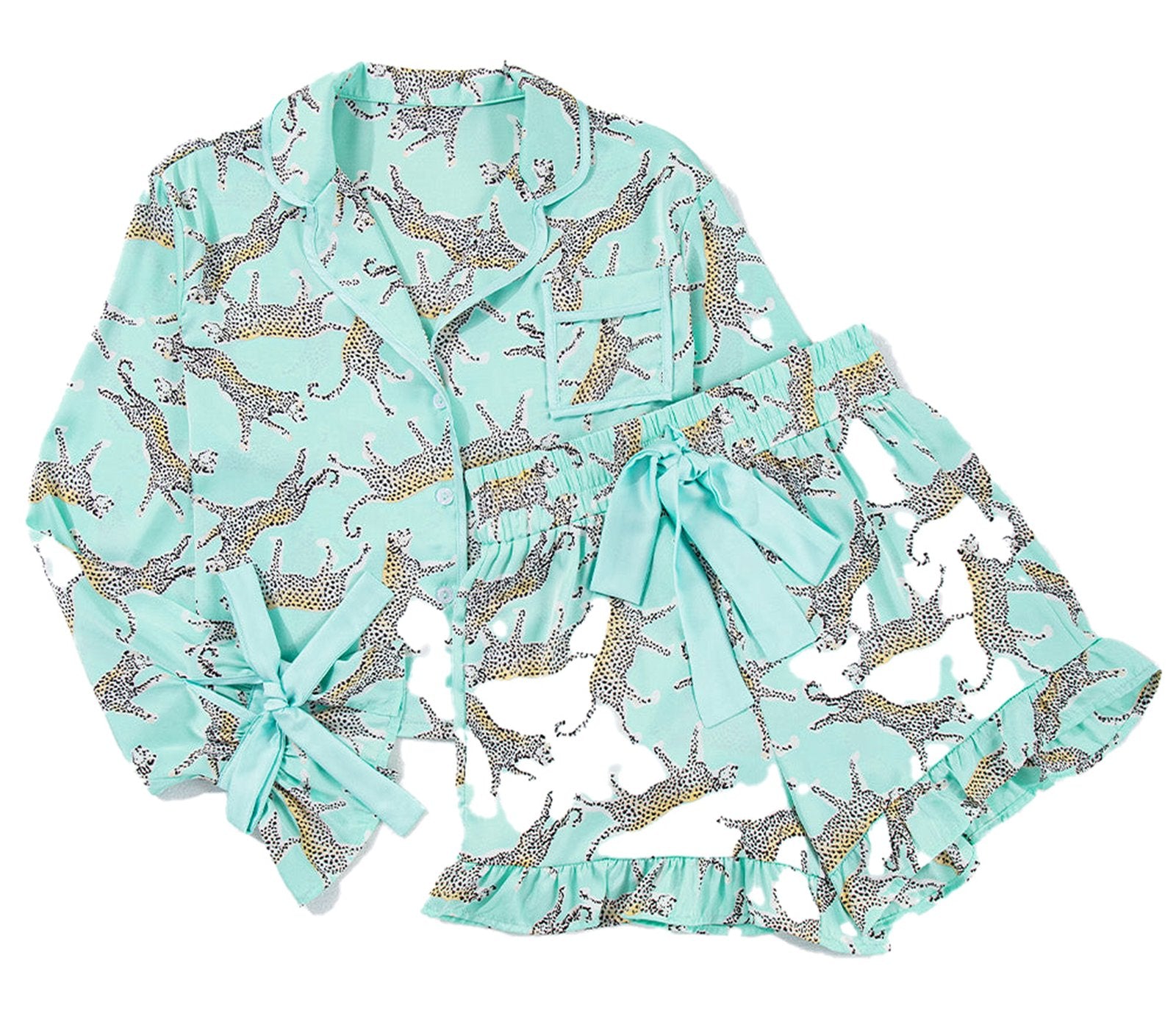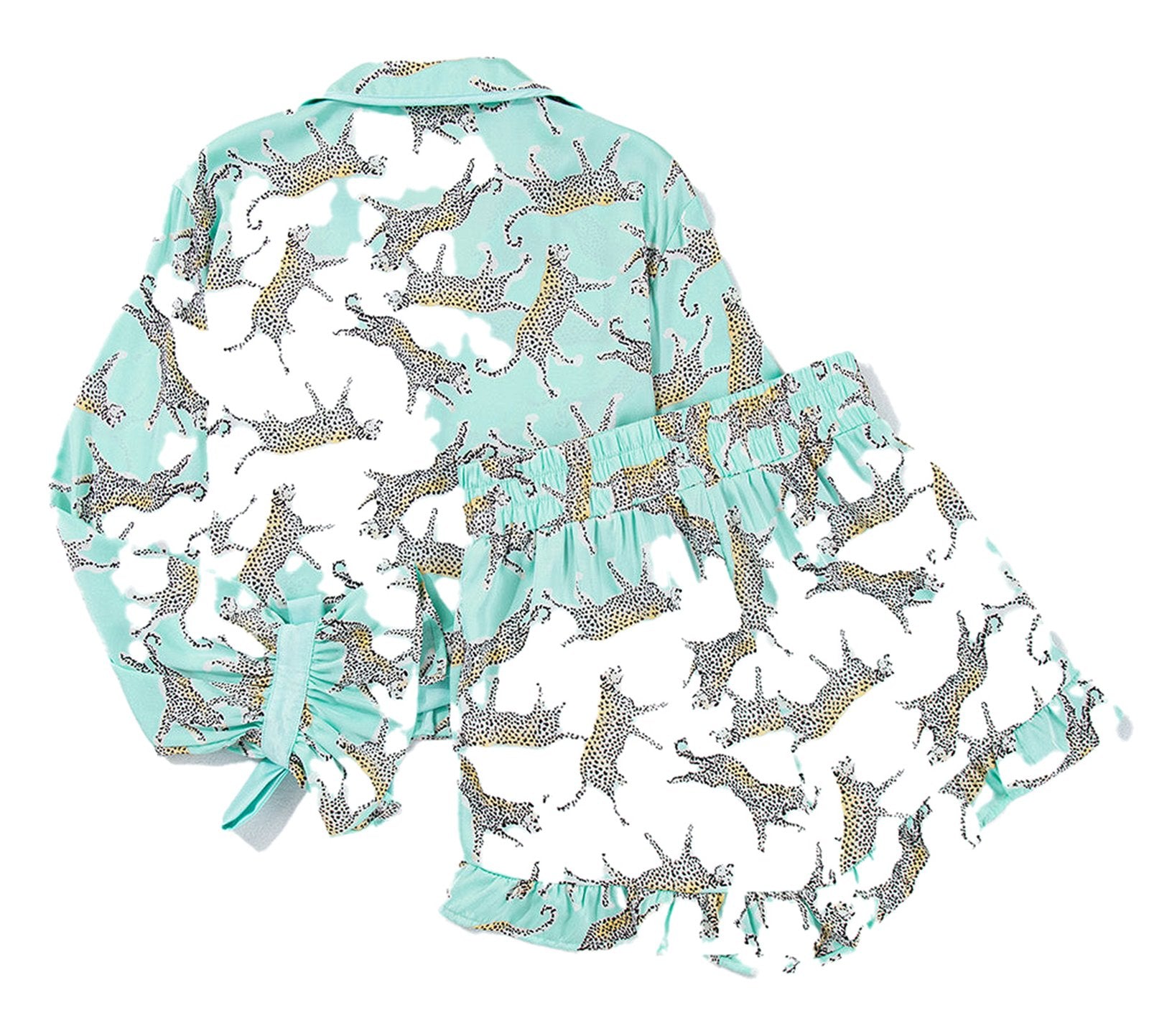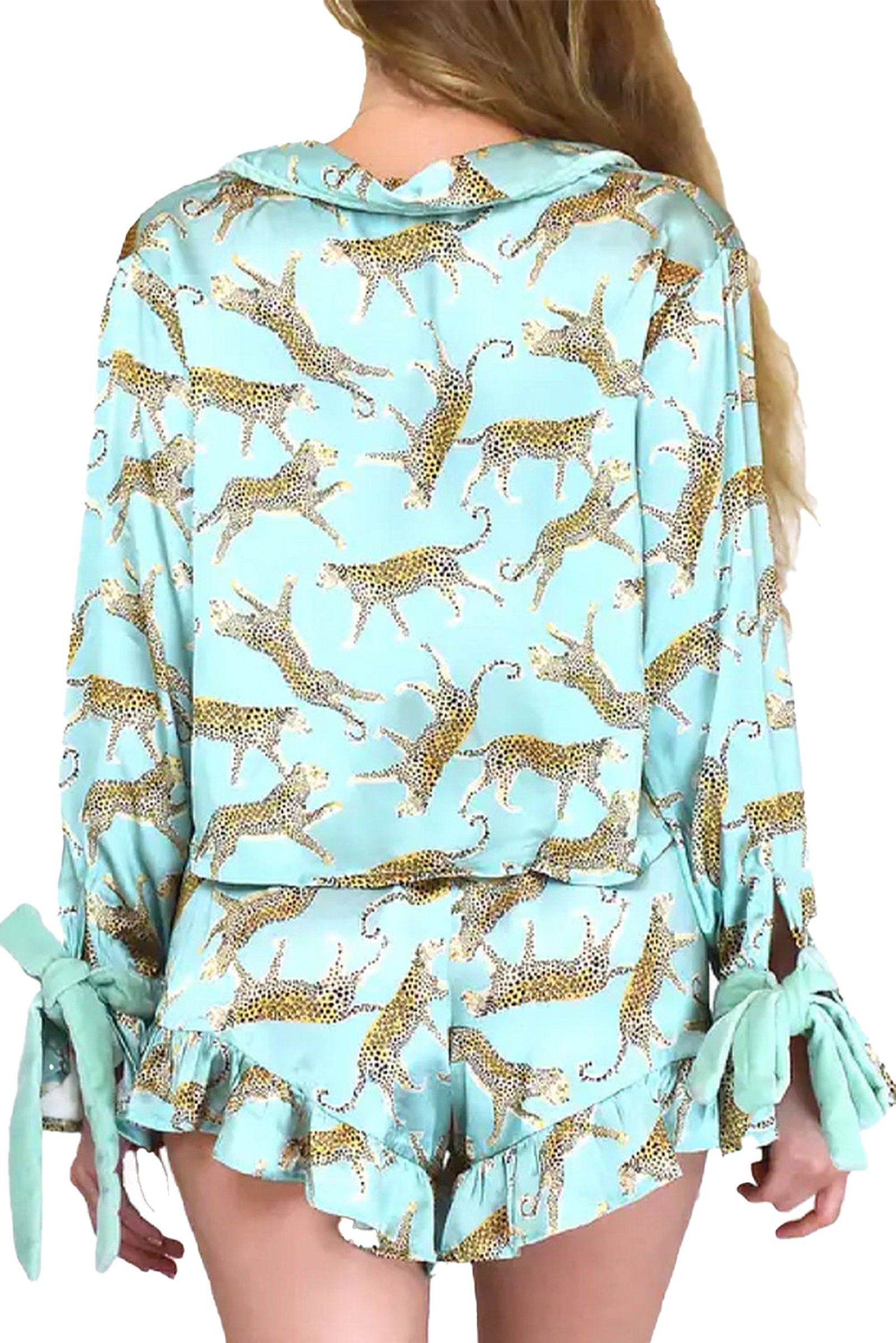 The green leopard satin pajama set includes a delightful short-sleeve button-up top. The top features a classic collar and a front pocket, combining functionality with elegance. The matching shorts are designed with an adjustable waistband, allowing for a perfect fit. The ruffled sleeves and shorts add a playful touch, making this set not only stylish but also trendy.