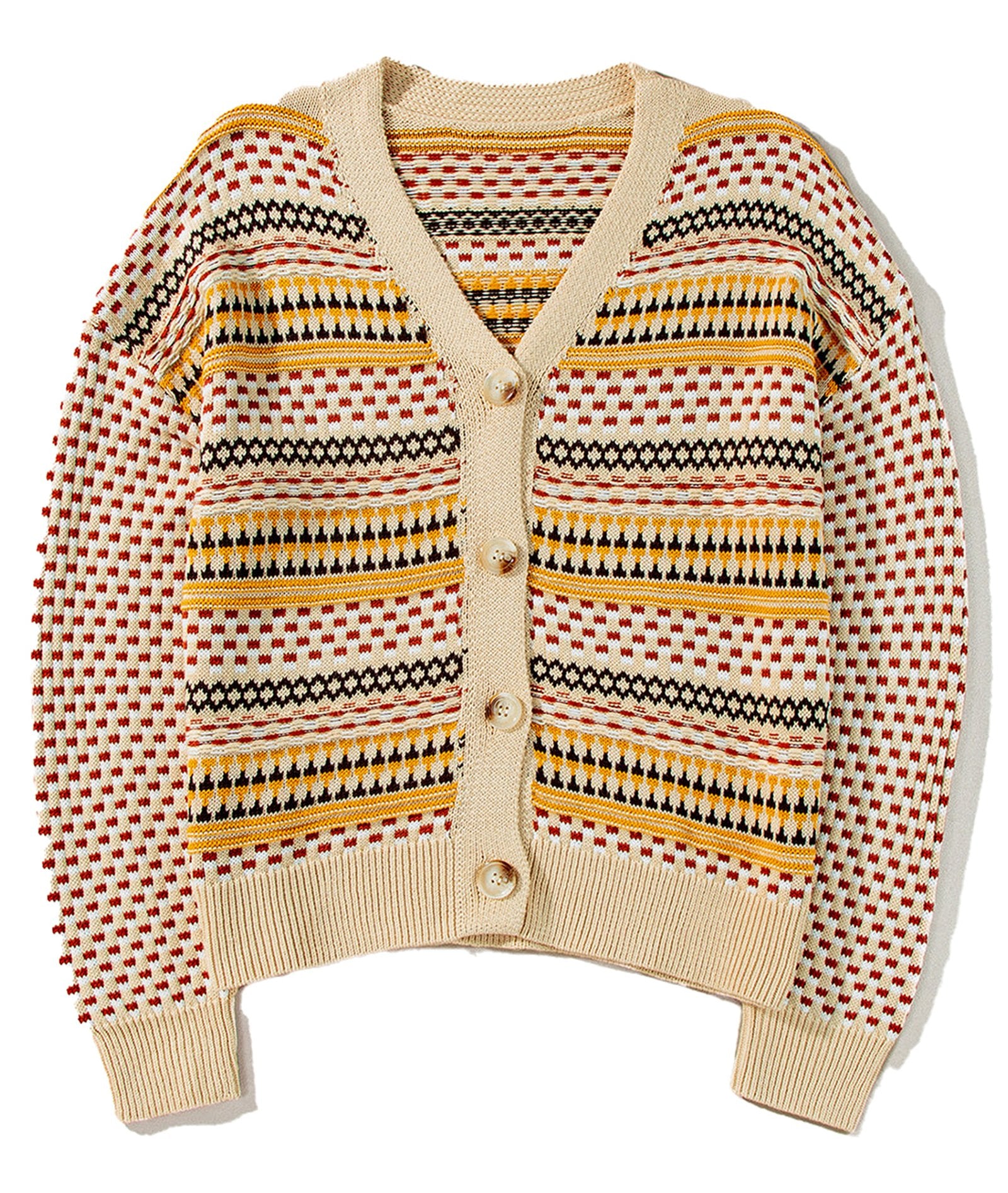 The khaki buttoned v neck cropped cardigan also showcases beautiful intricate patterns. It’s not just any cardigan, but a statement piece that reflects your individuality. Whether you're heading to brunch or a casual outing, this cardigan will have you looking effortlessly chic.
