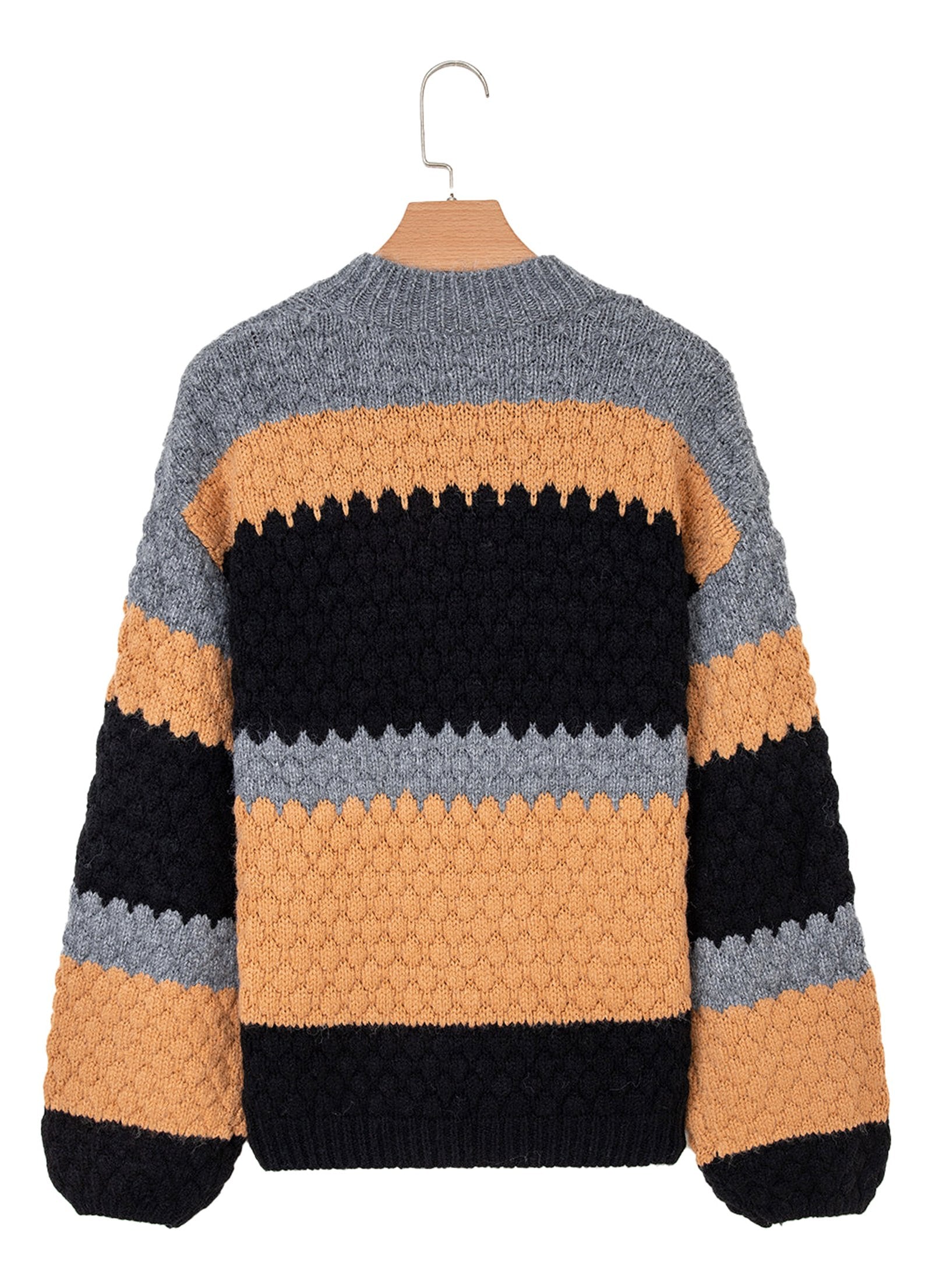 Elevate your wardrobe with the khaki color block high neck sweater from LuckeLadybug. This stylish sweater combines comfort with a modern design, making it a must-have for any fashion enthusiast. Its unique color block pattern features warm tones that not only catch the eye but also add a trendy flair to your outfit.