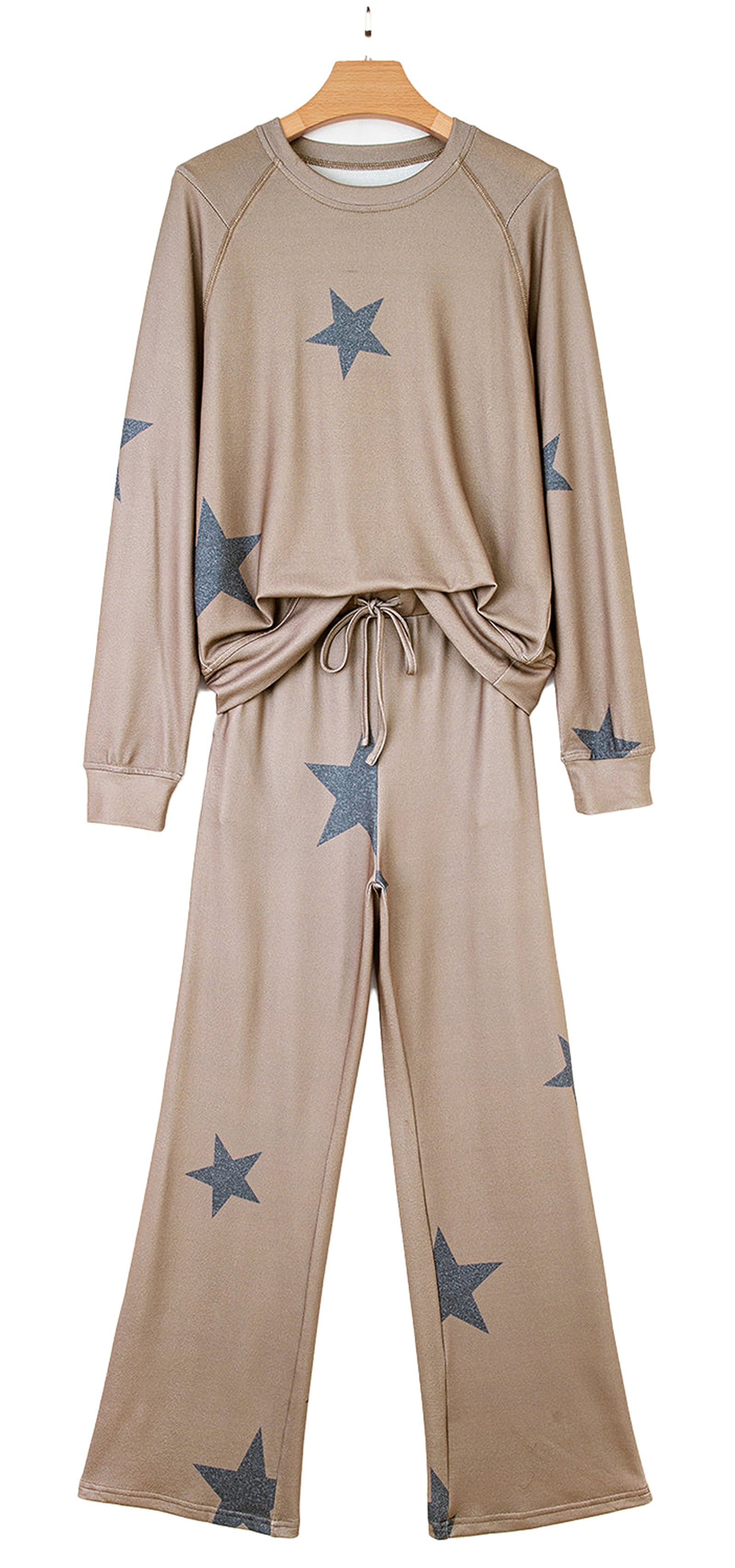 Perfect for gift-giving or a personal treat, this set makes an ideal choice for anyone who appreciates comfy yet fashionable loungewear. Experience the blend of style and practicality with the khaki star print lounge set. Whether it's a cozy night in or a casual day out, this is your go-to ensemble that embodies both comfort and modern style.