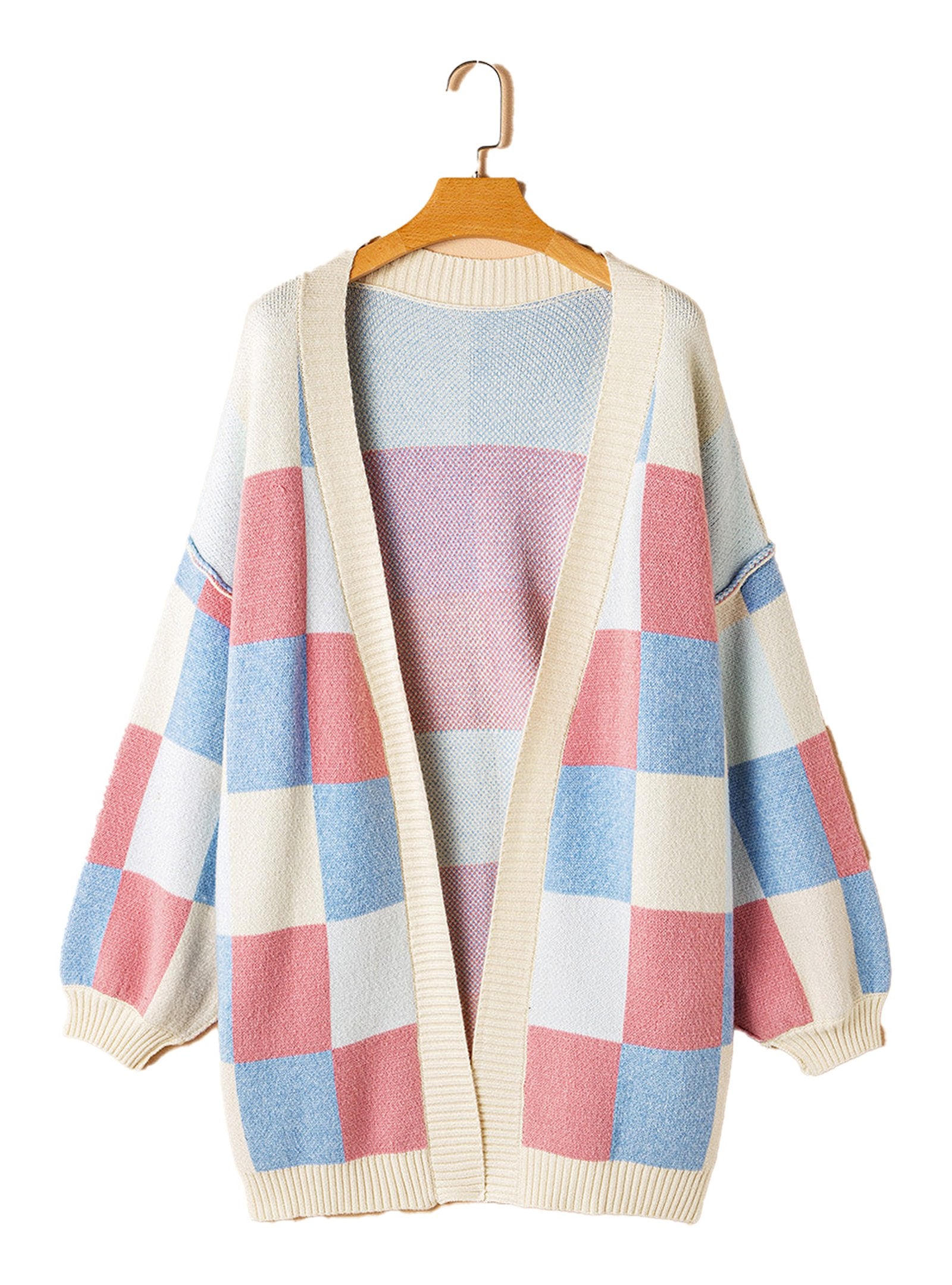 Introducing the Light Blue Checkered Drop Shoulder Exposed Seam Open Front Cardigan, a perfect blend of comfort and style. This light blue checkered cardigan provides a cozy layer for any outfit. Crafted with soft fabric, it feels gentle against your skin, making it a must-have in your wardrobe.