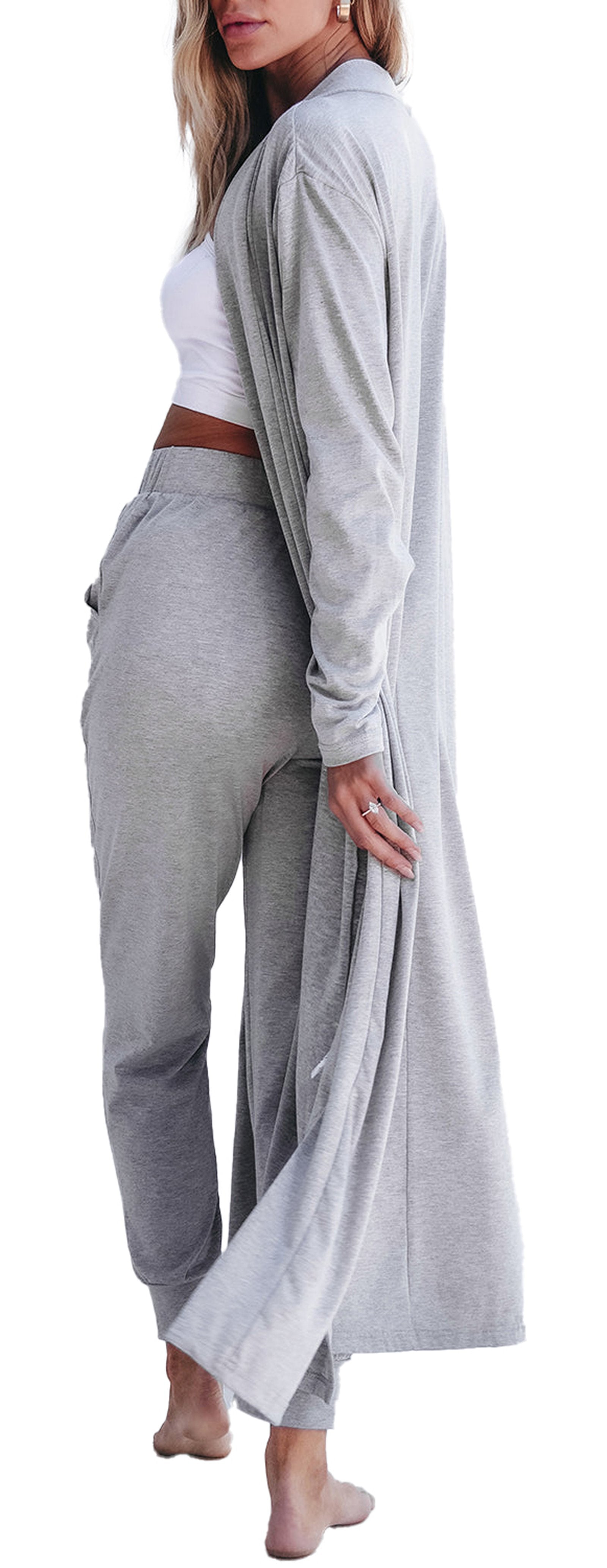 The light grey lounge set for women is made from a soft and breathable fabric that feels gentle against the skin. This ensures you stay comfortable all day long. The long cardigan adds a touch of elegance, making it great for lounging or stepping out for quick errands.