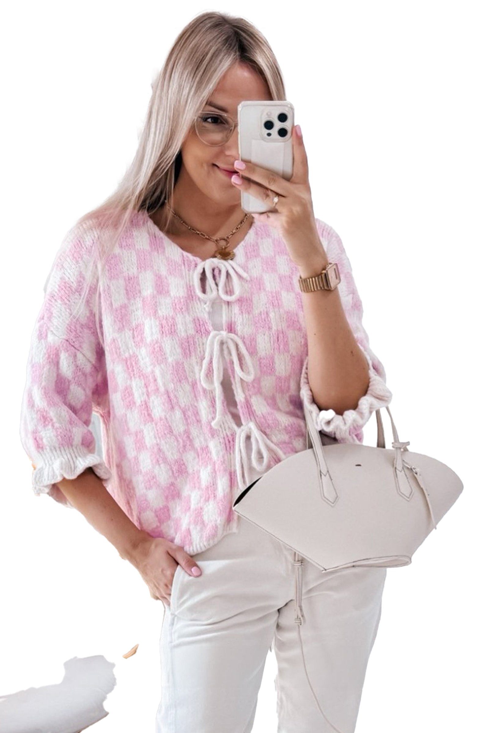 Pair the cardigan with jeans for a casual day out or style it over a dress for a chic evening look. Whether you're running errands or enjoying a brunch with friends, this versatile piece guarantees you’ll turn heads. The soft pink hues and checkered pattern make it a standout piece in any wardrobe.