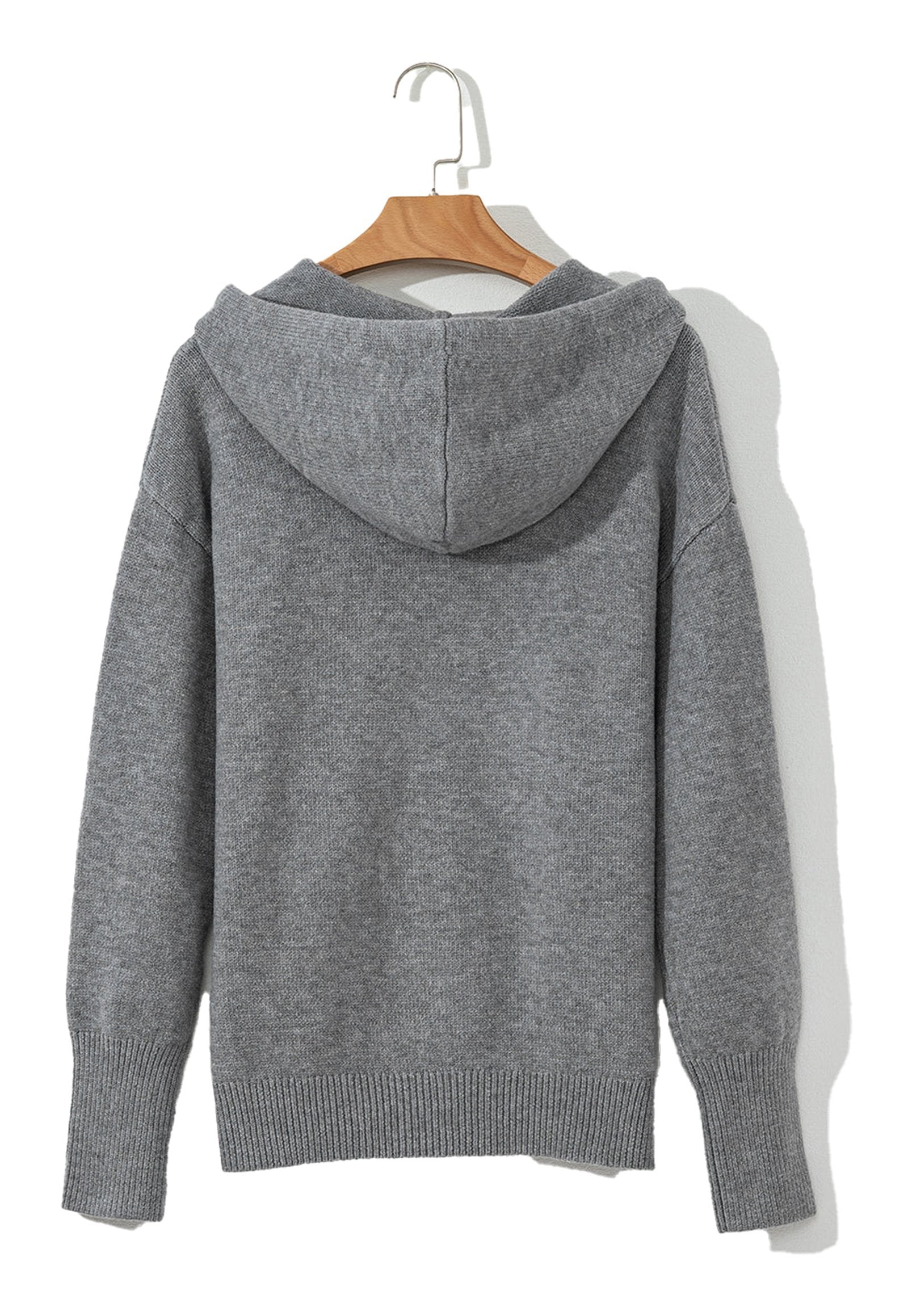 This cardigan stands out thanks to its stylish oversized sleeves, providing a modern twist to the classic design. Pair it with your favorite jeans or a cute dress for a chic look that never goes out of style. Whether you're heading out or snuggling up at home, this medium grey hooded sweater cardigan is the ideal layering piece.