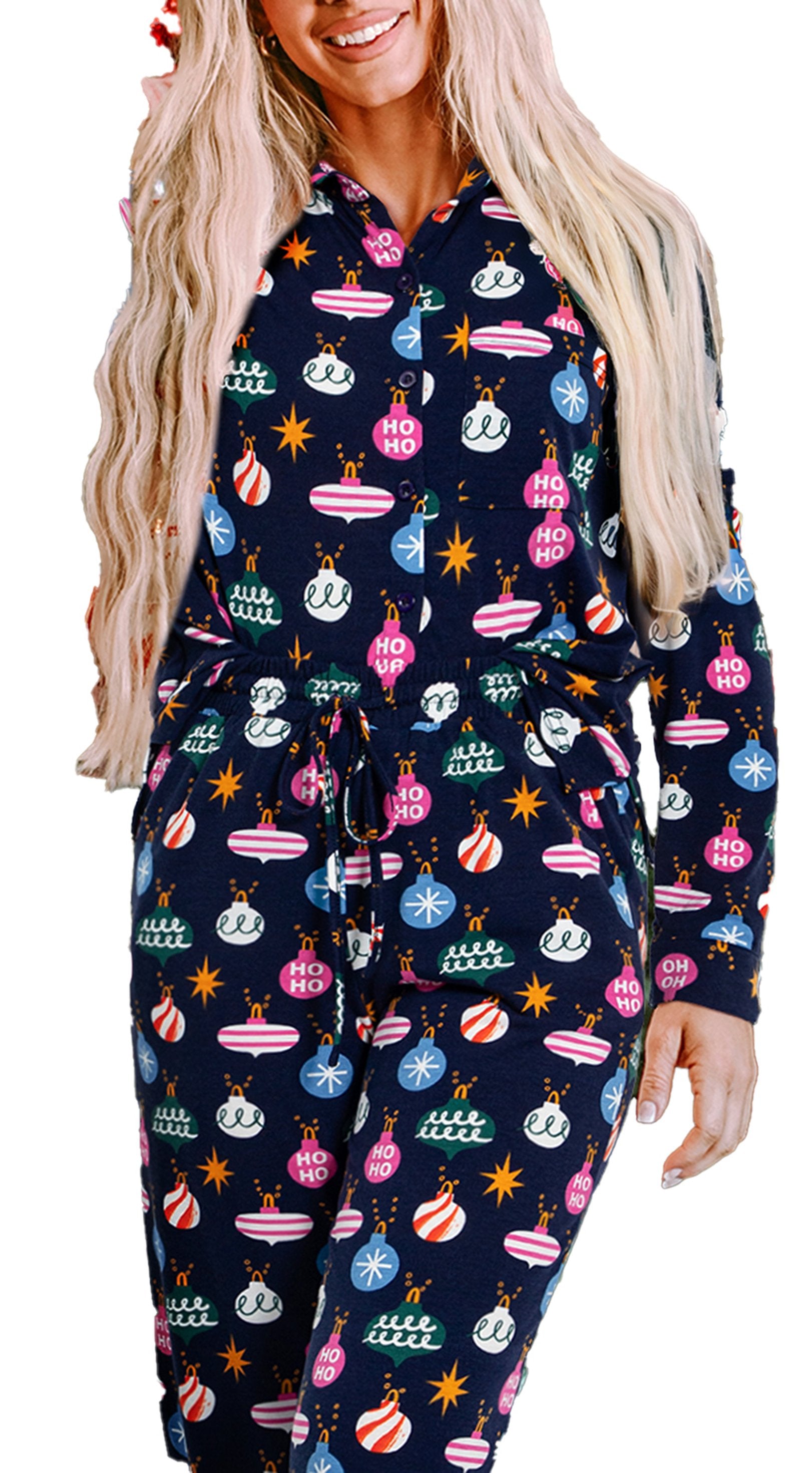 Celebrate the holiday season in style with our navy blue Christmas pajama set from LuckeLadybug LLC. This delightful pajama set features a vibrant print of Christmas lights and ornaments, perfect for embracing the festive spirit.