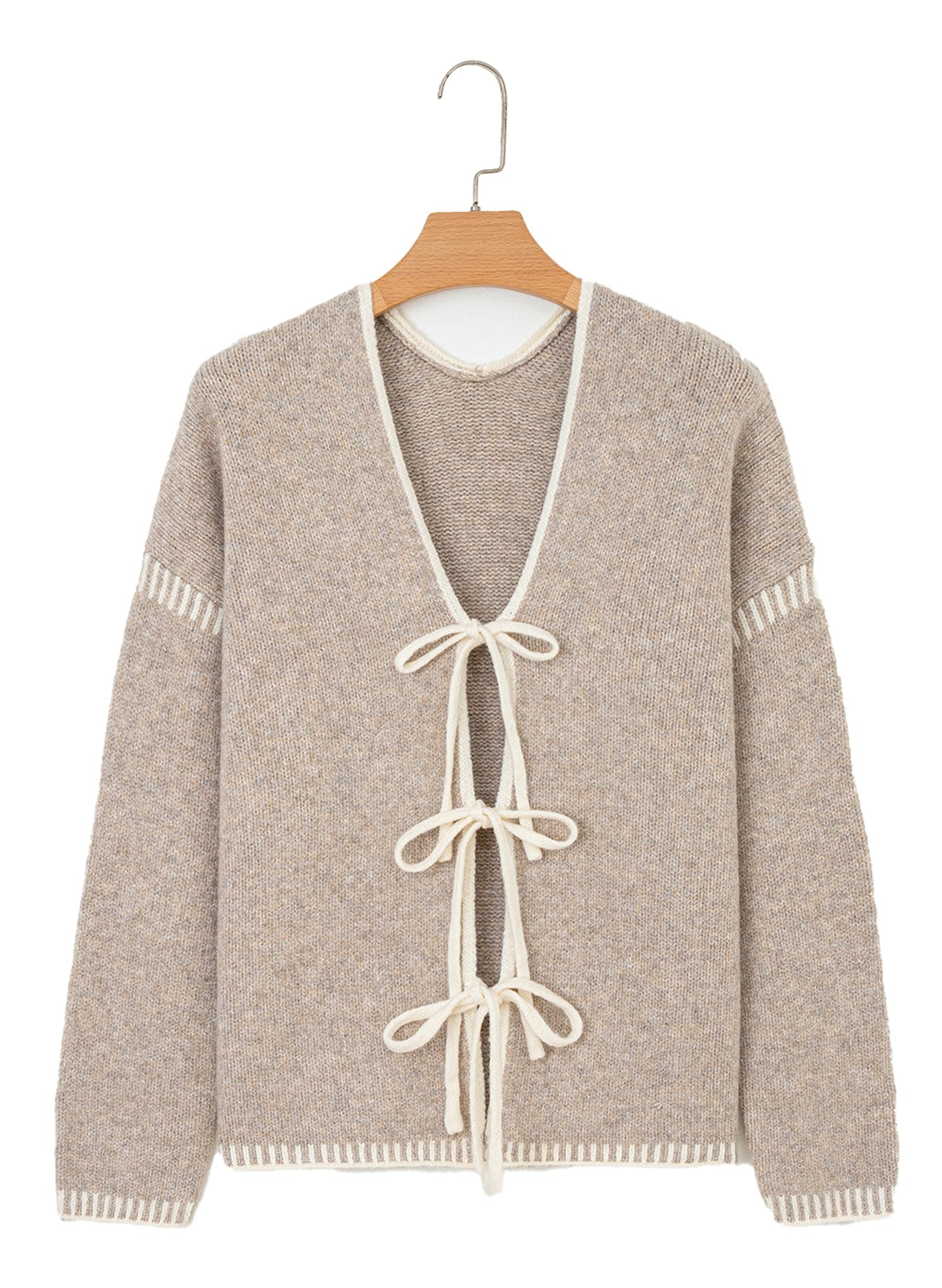 The unique tied front design sets this pale khaki tied front cardigan apart from traditional styles. Each tie embellishes the cardigan, giving it a chic twist that can elevate your look for any occasion. Whether you're dressing up for brunch or lounging at home, this piece will be your go-to.