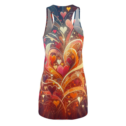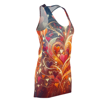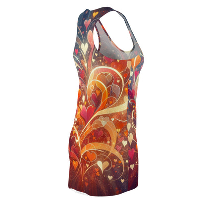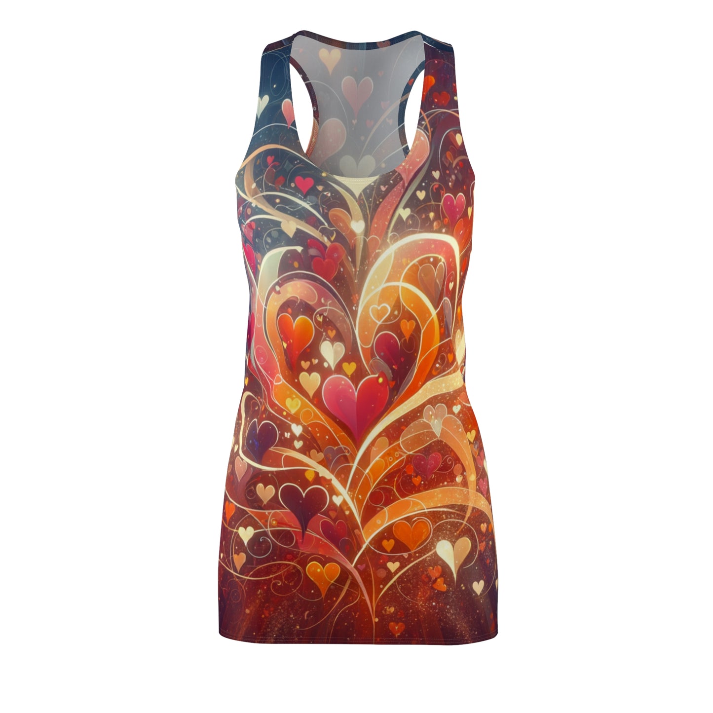 Step out in style with the women’s abstract heart dress. This racerback dress from LuckeLadybug combines vibrant art with modern fashion. The unique abstract heart print stands out at any event. The design blends deep reds, oranges, and golden swirls, making this women’s abstract heart dress eye-catching and trendy.