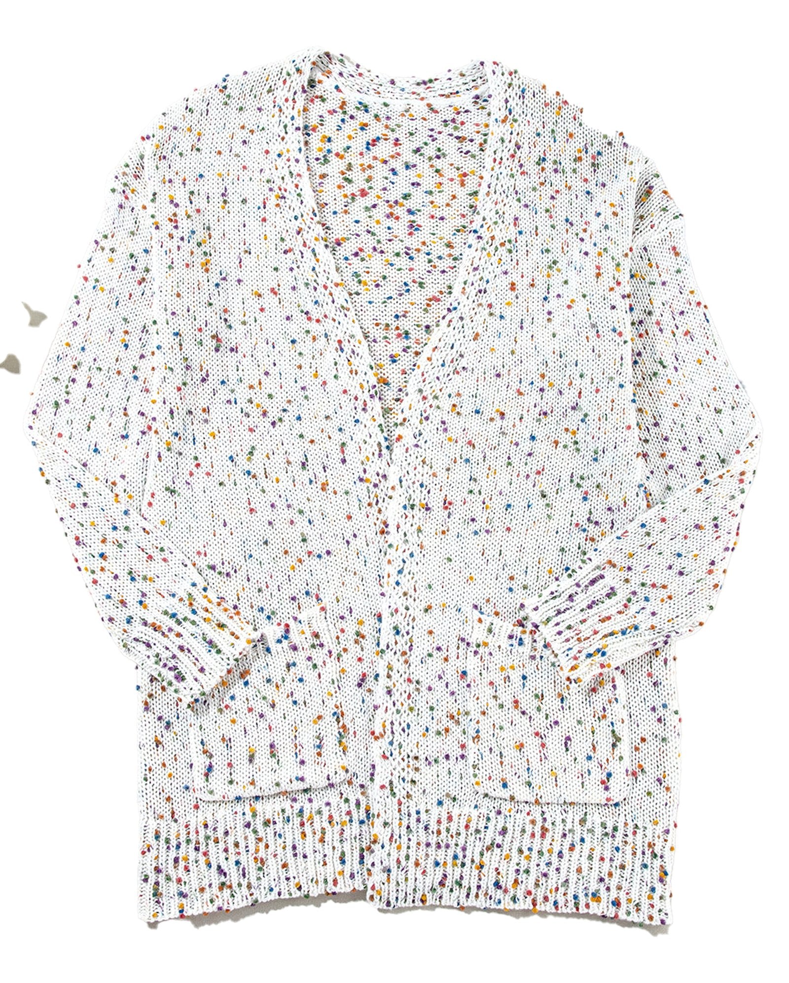 Introducing the white confetti rib knit cardigan, a perfect blend of style and comfort from LuckeLadybug LLC. This cardigan features a unique rib knit texture, adding an interesting twist to your everyday wardrobe. With its playful confetti design, it brings a fun pop of color to any outfit, making it an essential piece for your collection.