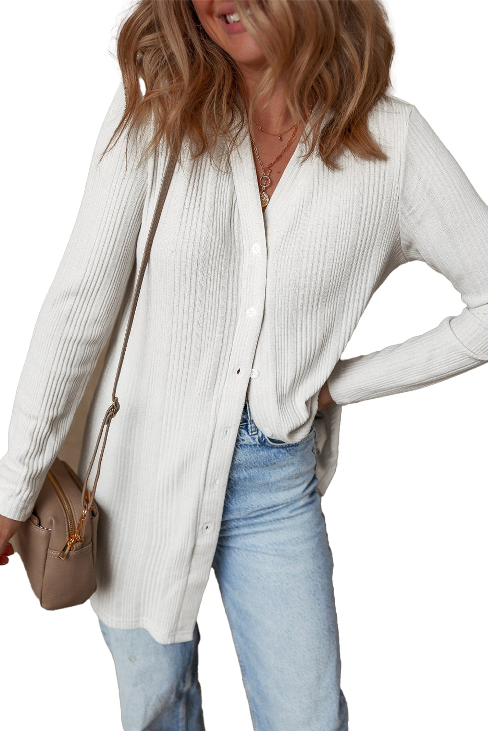 The button details add a unique aspect to the white ribbed button up tunic cardigan, making it stand out in a crowd. This cardigan is not just a piece of clothing; it's an essential style element that can transition from day to night with ease.