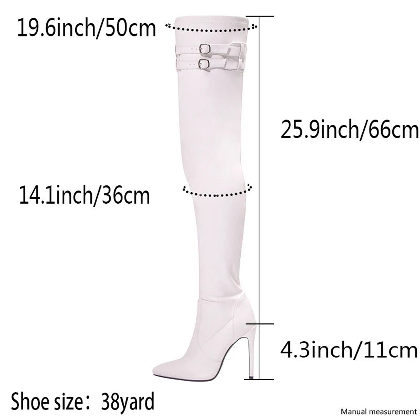 Featuring a sleek silhouette, these white thigh high boots for women effortlessly elongate your legs while offering maximum comfort. The adjustable buckle accents provide a unique flair, setting you apart in any crowd. Whether paired with a flirty dress or sharp jeans, these boots will amplify your outfit and make a statement.