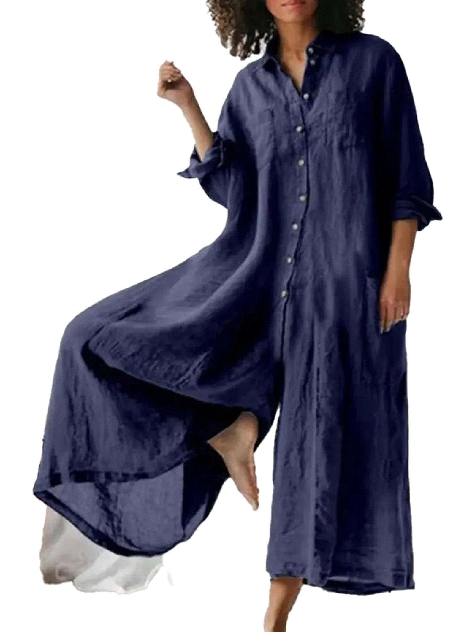The women's cotton linen jumpsuit features a relaxed fit, ensuring that you look chic without sacrificing comfort. The button-down design adds a touch of elegance, allowing you to wear it in various ways. Whether you’re heading to a casual brunch or a summer outing, this jumpsuit suits any occasion beautifully.