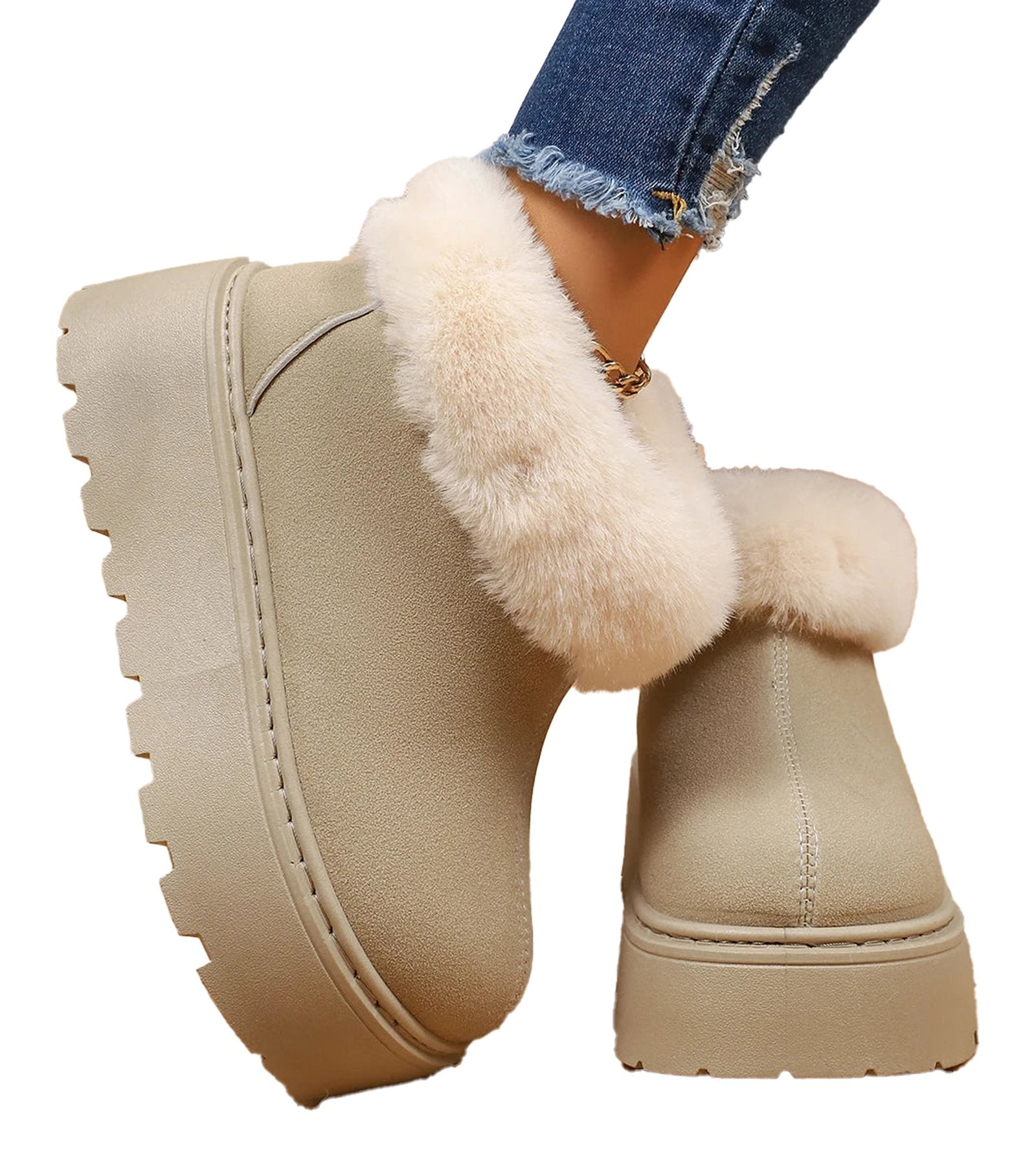 Step into winter with our stylish women's faux fur platform snow boots! These boots offer both comfort and flair, making them the perfect footwear for the chilly season. The chunkier platform design elevates your look, while the plush faux fur lining keeps your feet warm. Made for easy wear, these ankle boots feature a convenient slip-on style that saves you time during busy mornings.