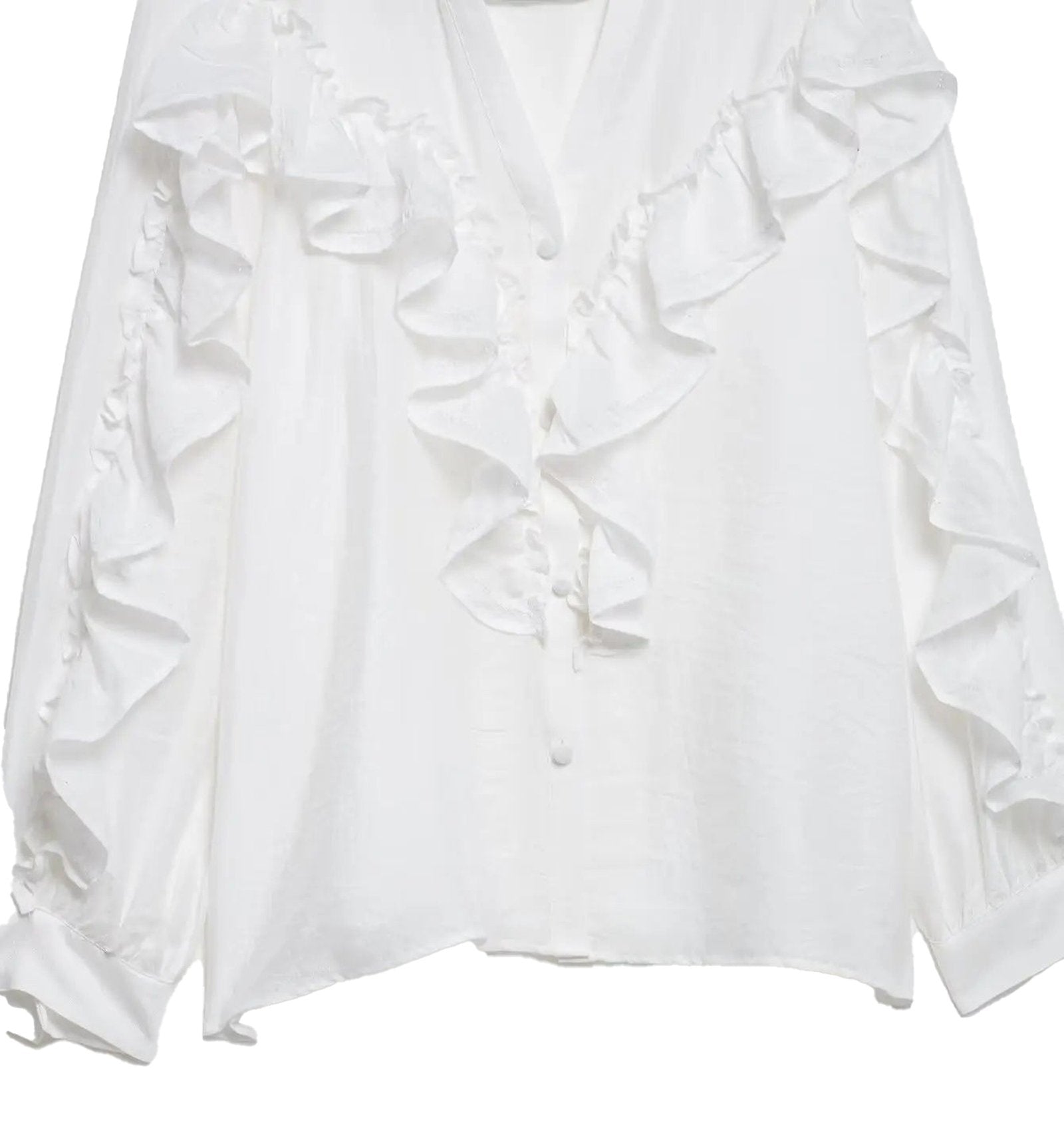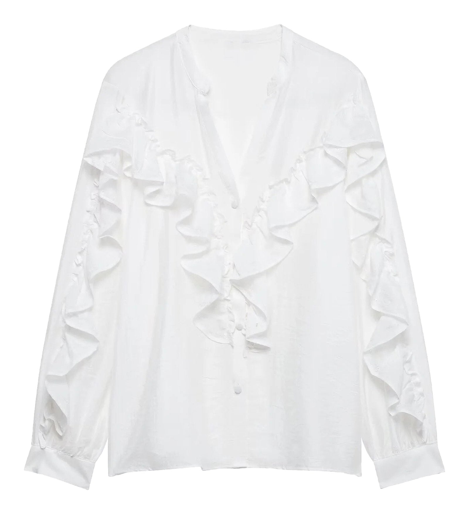 Discover the elegance of the women's ruffle blouse long sleeve from LuckeLadybug LLC. This blouse features a sophisticated V-neck design, making it a perfect choice for both casual outings and formal events. The standout element is the stunning ruffled decorations on the front and sleeves, adding a chic touch to your wardrobe.
