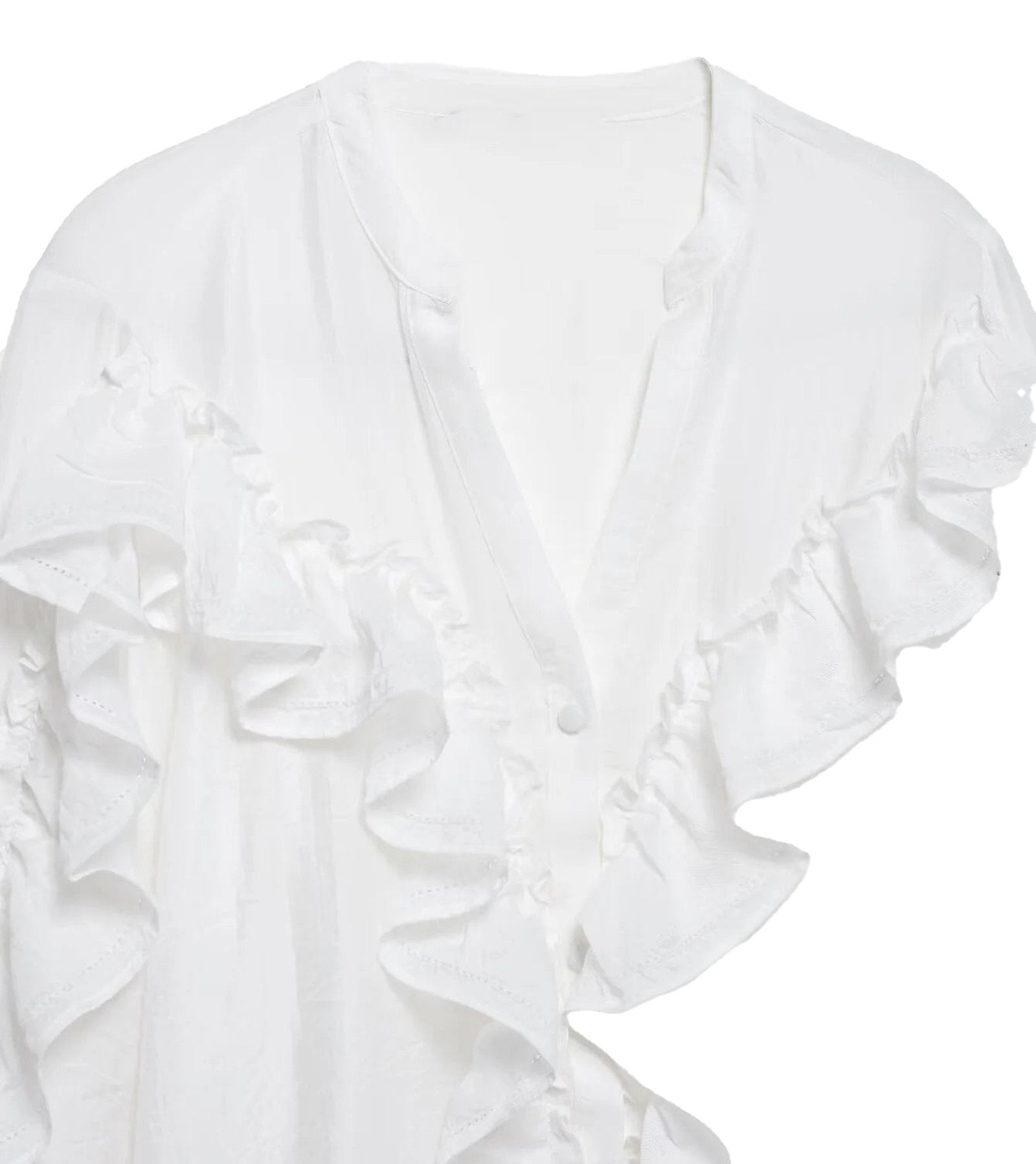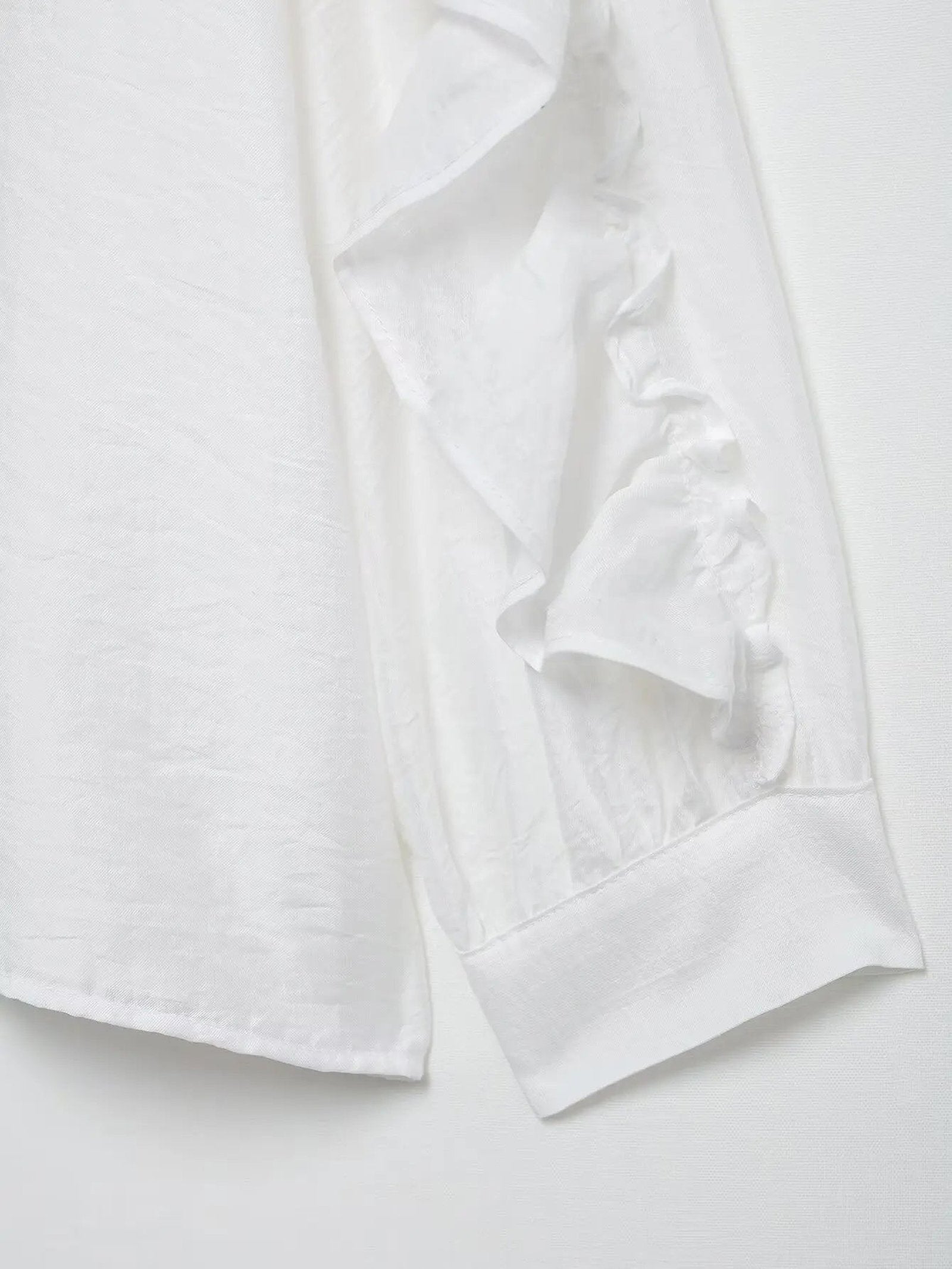 Showcases stylish ruffle detailing along the sleeves for a feminine touch.